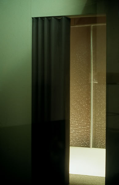 On the left of the front wall is a washbasin. Above it hang a mirror and a lamp. Visible next to the washbasin are, in their strangely bulky presence, the doors of a wardrobe. On the right wall of a dark-carpeted and green-painted room, a half opened folding curtain allows a view into an adjoining room, in which a shower cubicle can be seen. In the reflected image over the washbasin, a monitor and a window can be recognised. If these reflections had real existing counterparts, they would lie outside of the depicted space and behind the backs of the observers.
